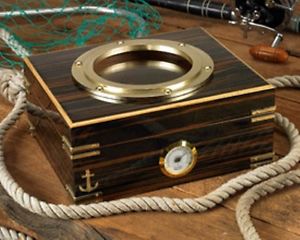 Ebony finish Humidor with linen on exterior, brass porthole with glass on the lid, quadrant hinges, brass hardware. Dimensions (Outside): 10" x 8" x 4"